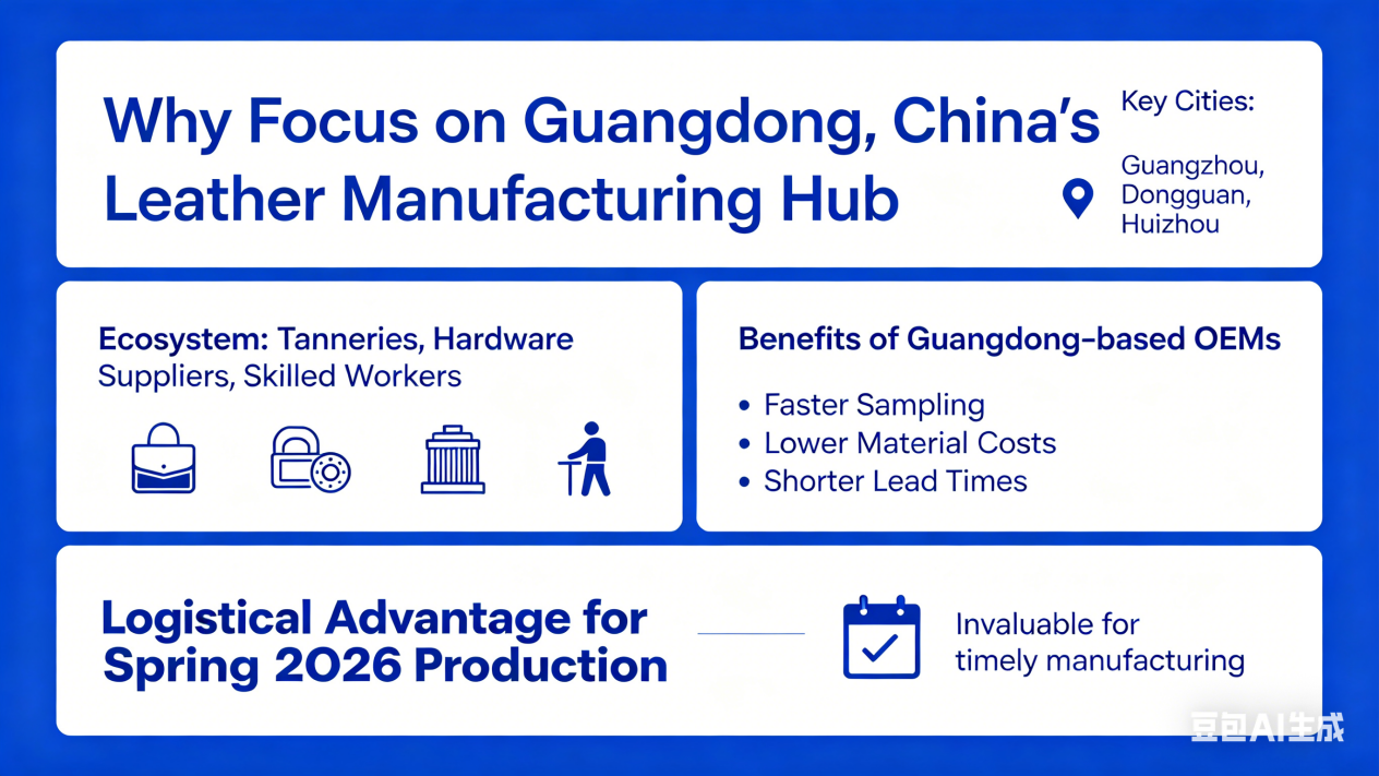 China's leather manufacturing hub is concentrated in Guangdong province, particularly Guangzhou, Dongguan, and Huizhou. This region offers an unmatched ecosystem of tanneries, hardware suppliers, and skilled workers. When searching for a China leather bag OEM factory, prioritizing Guangdong-based operations gives you faster sampling, lower material costs, and shorter lead times. A factory here can source specific leathers or hardware within days. For Spring 2026 production, this logistical advantage is invaluable.