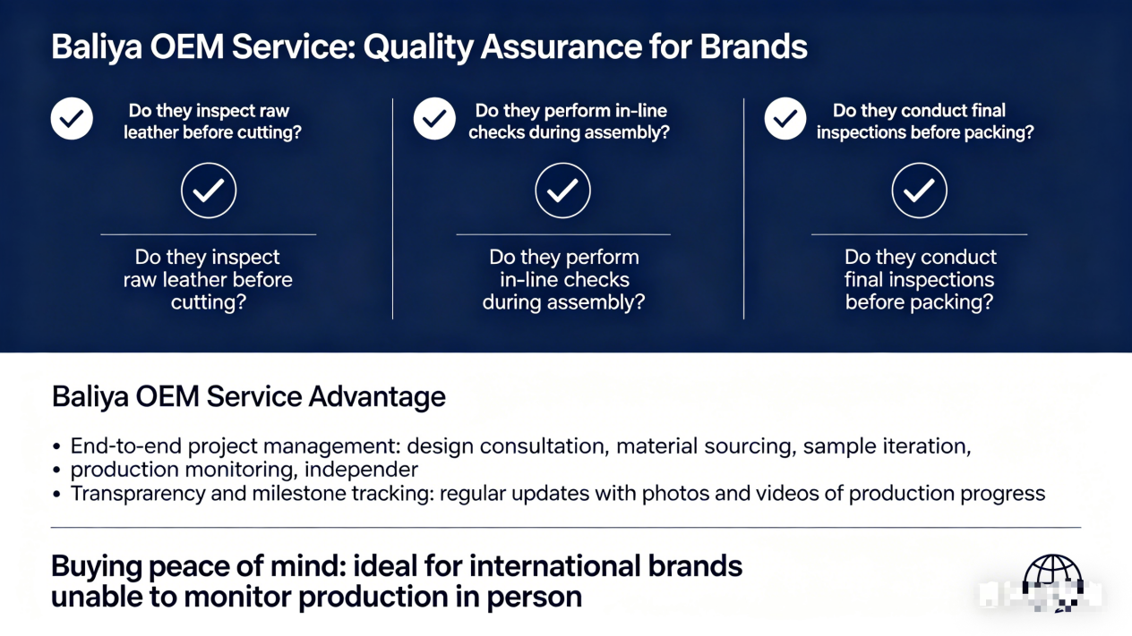 Quality consistency is the top concern for brands outsourcing production. Without proper systems, you risk receiving defective batches. Ask potential partners about their quality control process. Do they inspect raw leather before cutting? Do they perform in-line checks during assembly? Do they conduct final inspections before packing? A factory serious about quality will have documented procedures and share inspection reports.