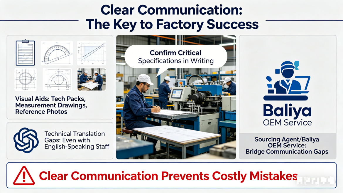 Even the best factory will struggle if communication breaks down. Use visual aids like tech packs, measurement drawings, and reference photos. Confirm critical specifications in writing. While many Chinese factories have English-speaking staff, technical details can still get lost in translation. Consider working with a sourcing agent or using theBaliya OEM service to bridge communication gaps. Clear communication upfront prevents costly mistakes later.